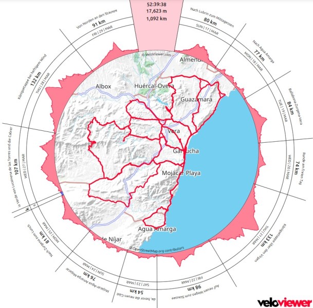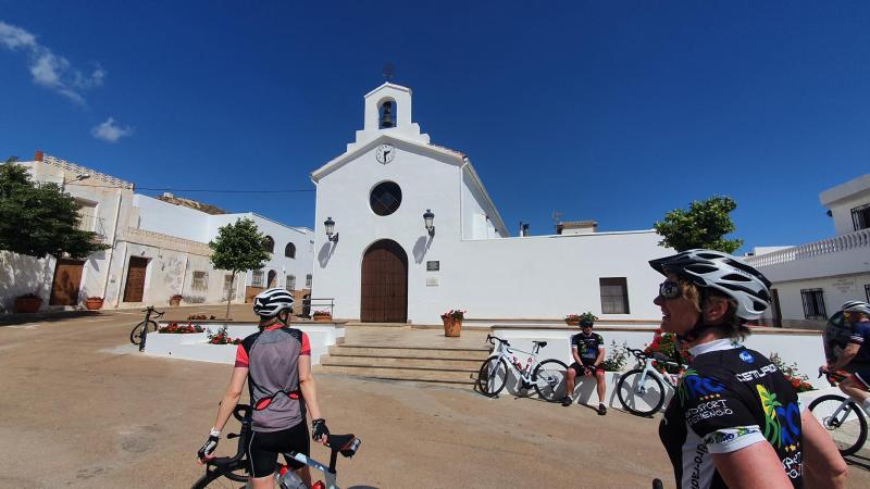 Die meisten Gäste erreichen Mojacar (Andalusien, Südspanien) mit dem Flugzeug bis Alicante und anschliessend mit einem Bustransfer. Untergebracht sind wir im Hotel “ALEGRIA Palacio Mojacar”, welches sich etwas ausserhalb Mojacar, dafür sehr nahe am Strand, befindet. Es ist eigentlich ein Golfhotel mit einem Golfplatz, wo wir aber unsere Bikestation im Keller eingerichtet haben.