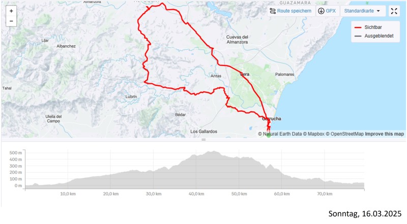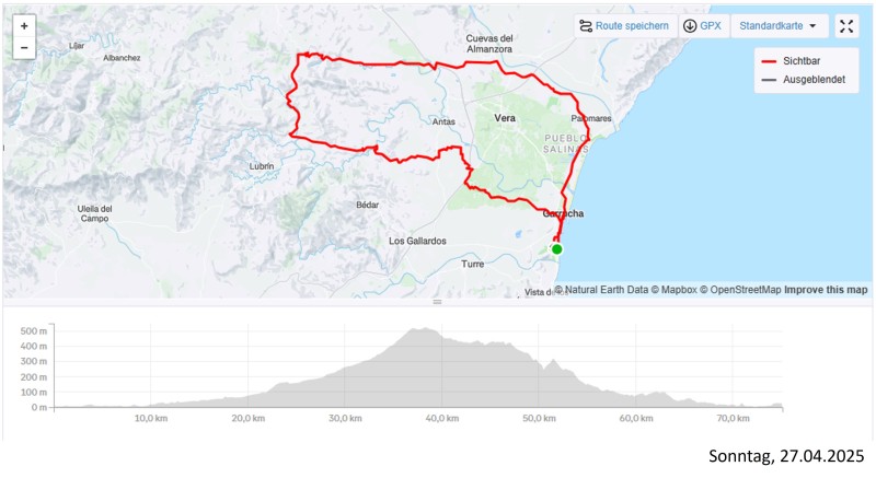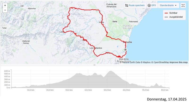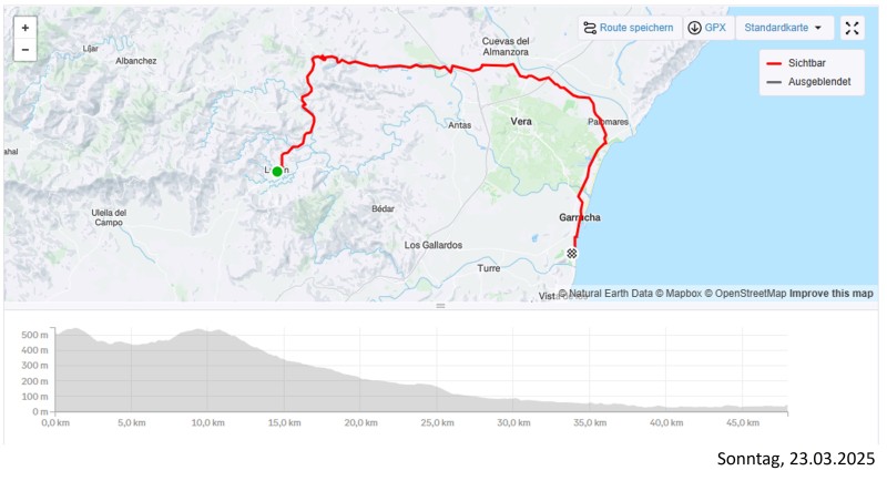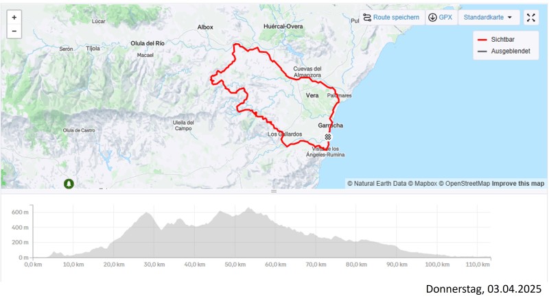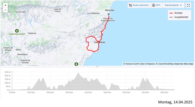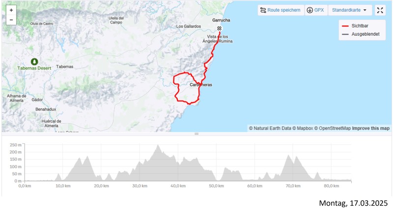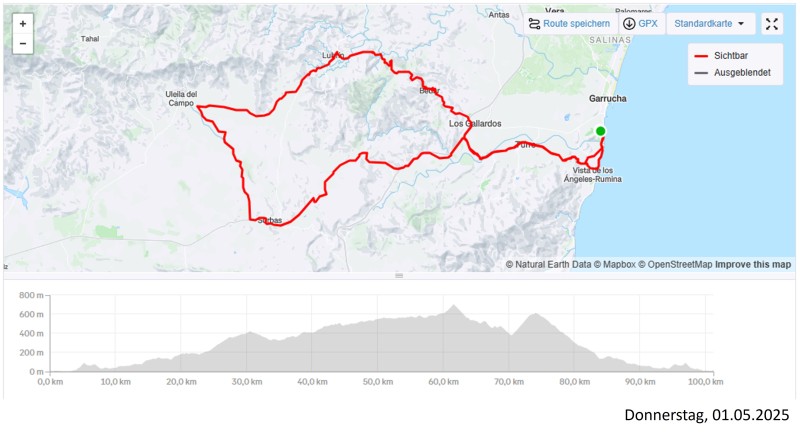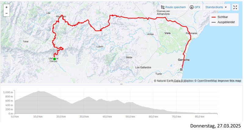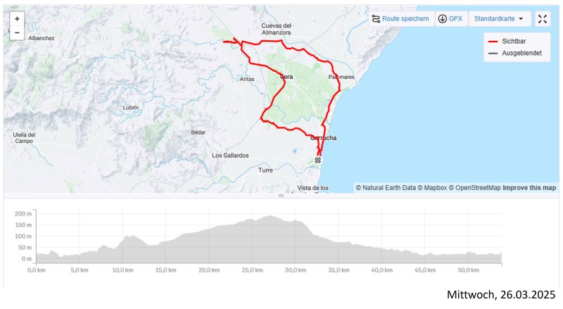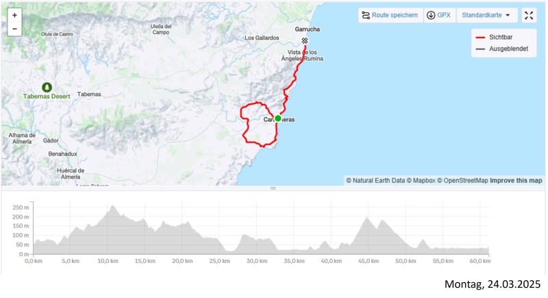 Auch dieses Jahr darf ich wieder als Guide Gäste von Eitzinger Sports auf dem Rennrad durch einen kleinen Teil der Region Almeria (Andalusien, Spanien) führen. Die dabei entstehenden Bilder stelle ich in einem separaten Fotoalbum zusammen. Zusätzlich wird das Titelbild des Postings in einer separaten Karte dargestellt.