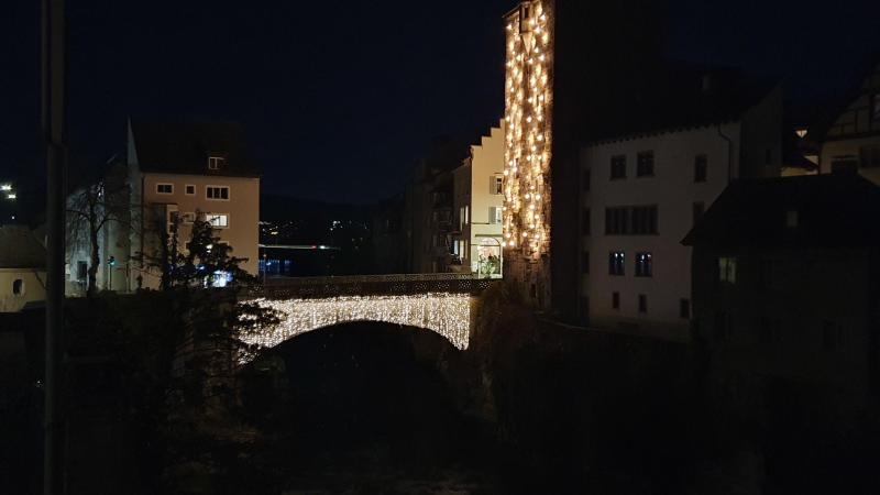 Aarebrücke und schwarzer Turm zur Adventszeit