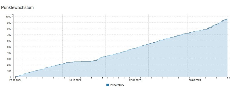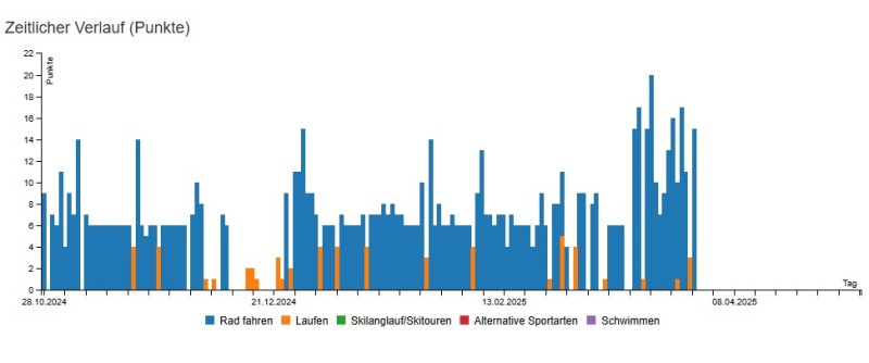 Während der Zeit des Winterpokals zählt vor allem die Zeit der sportlichen Betätigung. Pro Viertelstunde Radfahren gibt es einen Punkt. Bei anderen sportlichen Tätigkeiten gibt es etwas weniger Punkte. Angefangene Viertelstunden verfallen. Das mir gesetzte von 1’000 Punkten habe ich nicht zuletzt auch wegen der Erkältung von Anfang Dezember mit 966 Punkten zwar knapp verfehlt, doch meinen Trainingsstand und meine Ausdauer konnte ich trotzdem recht gut durch den Winter bringen.