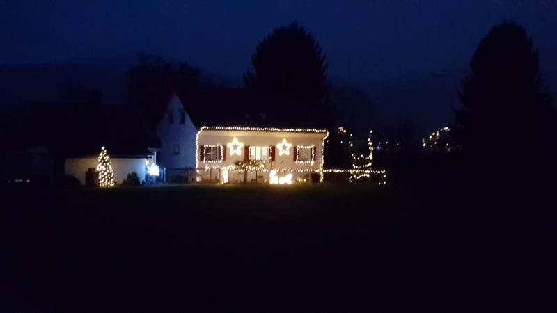 Weihnächtlicher Bauernhof in VeltheimWoche vom 18.12.2017 bis 24.12.2017; Nach dem Regen kam der Nebel. Er sitzt nun schon die ganze Woche fest auf unseren Hügeln herum. Zum Album