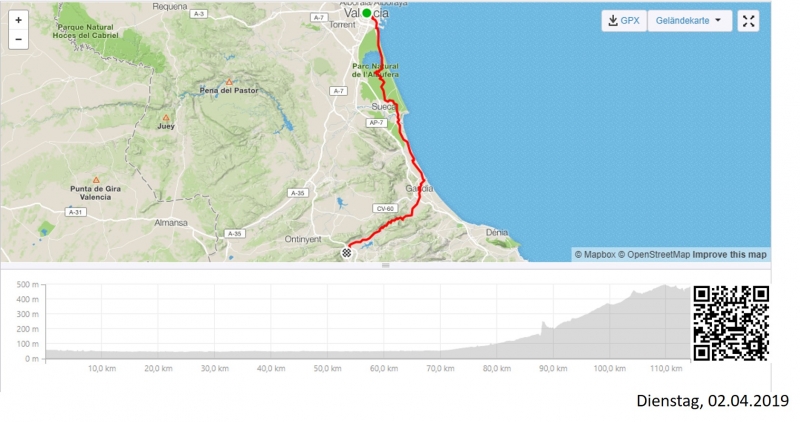Die Radroute durch die Region Valencia entpuppt sich zwar als sehr abwechslungsreiche Fahrt. Gute, rennradfähig aufbereitete ehemalige Bahnstrecken, wechseln sich ab mit teilweise sehr grobem Schotter, auf dem wohl kaum mehr Mountainbikes unterwegs sein würden. Auch scheint der GPS-Track, der eigentlich die offizielle Radroute anzeigen sollte, nicht korrekt und vollständig zu sein. Strassen und Brücken “fehlen” oder wurden “verlegt”. Insgesamt leider eine sehr mühsame und aufwändige Fahrt. Bekomme deshalb einen sehr schlechten Eindruck dieser Radroute. Obwohl die Strecke landschaftlich insgesamt sehr interesssant ist. Nach einer Regenphase anfangs der Woche, wird das Wetter bald besser und wärmer. Am Sonntag bereits die erste Ausfahrt mit Gästen von Eitzinger Sports ab Mojacar.