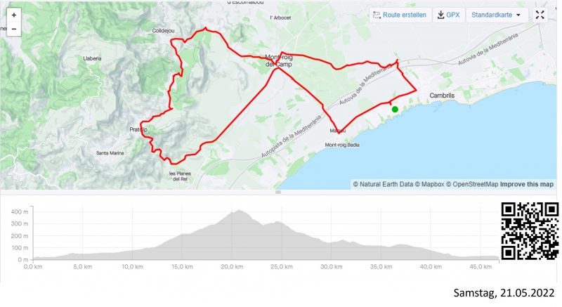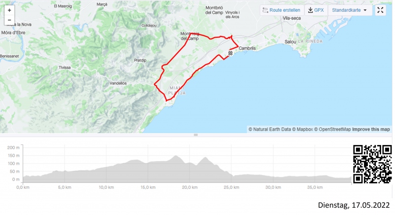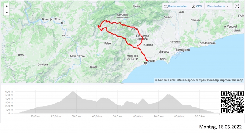 In der dritten Woche als Guide für Gäste auf dem Rennrad von Eitzinger Sports in Cambrils darf ich eine etwas schnellere Gruppe führen. Weil das Mittagessen aber fast jeden Tag für alle Gruppen am gleichen Ort stattfindet, erhalten die Strecken der letzten beiden Wochen jeweils meist vor dem Mittagessen eine kleine Zusatzrunde. Etwas tiefer ins Hinterland hinein und damit meist auch über den einen oder anderen zusätzlichen Hügel. Für mich sind es oft neue Strecken mit neuen Eindrücken. Nebst dem Mehr an Höhenmetern ergibt sich so natürlich meist auch ein Mehr an meist schnellen Streckenabschnitten in die Tiefe.