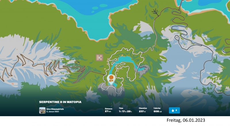 Eine abwechslungsreiche erste Woche des neuen Jahres. Nicht nur zeigte sich das Wetter von vielen verschiedenen Seiten auch meine betriebenen Sportarten sind jetzt um eine Version reicher geworden. Nebst dem Radfahren und einzelnen Läufen, sind nun auch Fahrten in virtueller Umgebung zu einem festen Bestandteil meiner sportlichen Aktivitäten geworden. Das abgelaufene Probeabonnement bei Zwift habe ich eben um einen Monat verlängert.