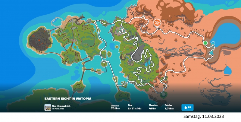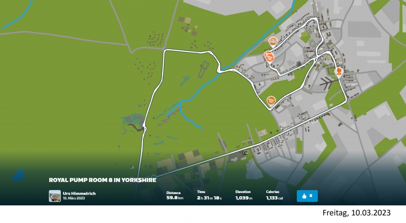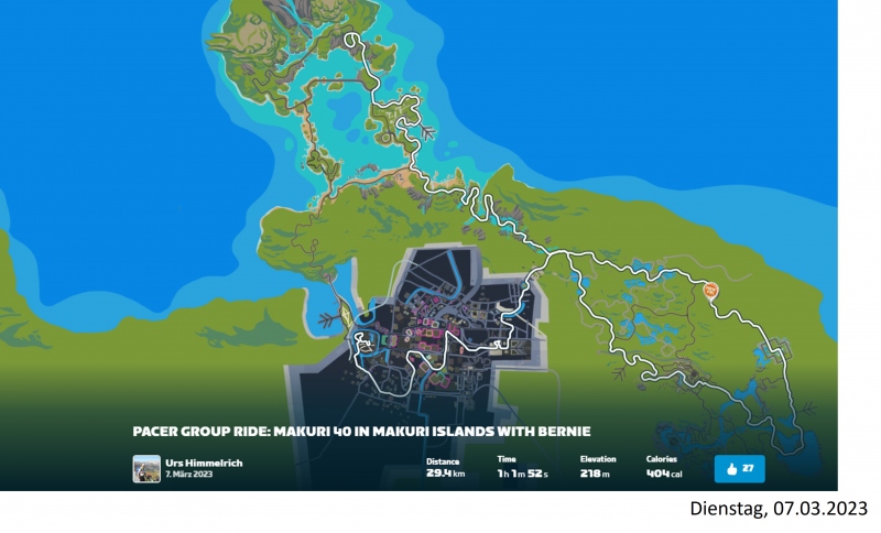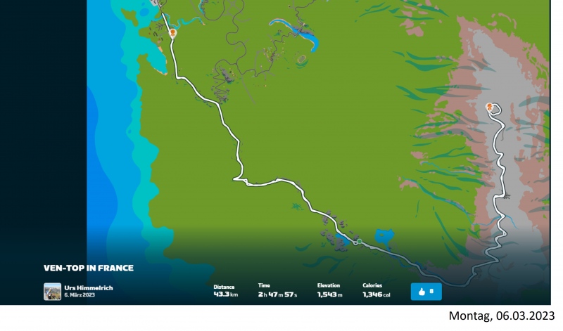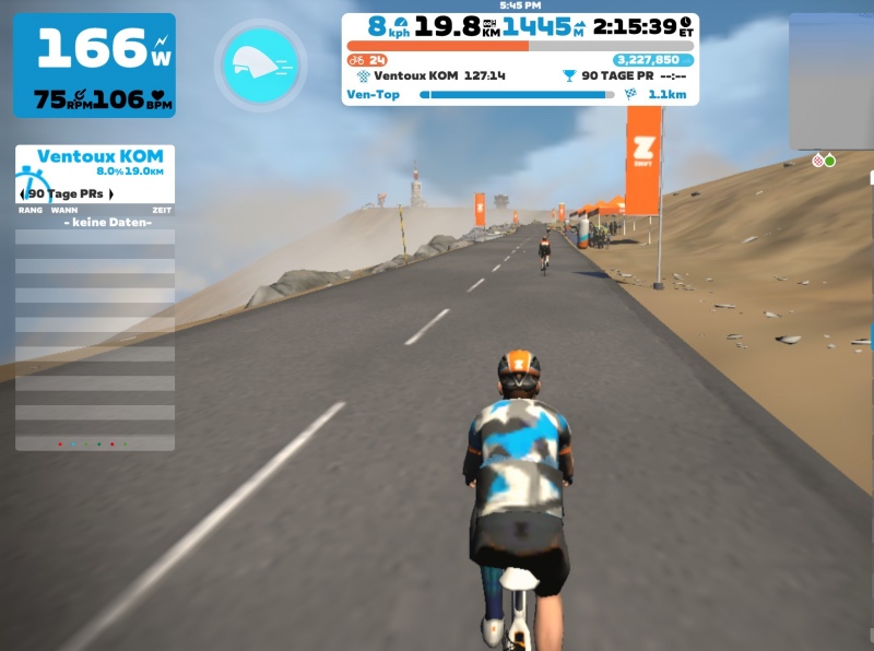 Einige der Strecken in dieser virtuellen Umgebung sind “natürlichen” Strecken draussen nachempfunden. So sind einige Rundkurse von Weltmeisterschaften vorhanden oder auch so berühmte Berge und Rampen wie zum Beispiel die Alpe d’Huez welche ich vor einer Woche gefahren bin, oder der Mont Ventoux. Diesen hatte ich diese Woche besiegt.