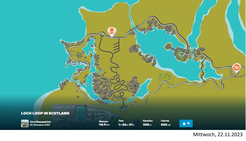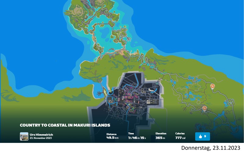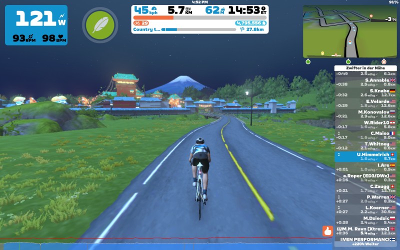 Wenn die Bauarbeiter gegen Abend das Haus verlassen haben, wollte ich auch nicht noch eine Runde durch die Dunkelheit fahren und begnügte mich dann halt mit Fahrten durch die virtuellen Welten von Watopia, London, Paris, Schottland und Makuri Island.