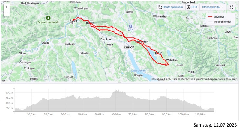 Auf die Hitzetage der letzten Woche folgte eine markante Abkühlung mit Regen und in höheren Regionen sogar mit Schneefall. Doch der Schreck war bald vorbei und ab der Mitte der Woche konnte ich bereits wieder draussen, meist sogar bei recht angenehmen Temperaturen meine Runden drehen. Sogar den Granfondo für den Juli konnte ich bereits erfüllen. Ich fuhr diesmal nicht einfach auf alt bekannten Strassen in unserer Umgebung herum, sondern wählte mir eine Strecke in Richtung des Greifensees. Etwa ein drittel dieser Kilometer rollte ich auf für mich bisher noch unentdeckten Strassen.
