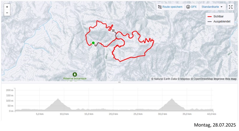 Eine weitere nasse und auch weiterhin zu kühle Woche zieht über das Land. Ich wage mich dennoch an zwei Tagen für Radfahrten hinaus, kurve zwischen Wolken und Schauern herum und schaffe es sogar trocken über die Strecken zu kommen. Zwei kurze Ausflüge zu Fuss finden auch noch Platz in der Woche. An drei Tagen verweile ich nochmals in der virtuellen Umgebung von Frankreich. Irgendwie haben es mir diese neuen Strecken durch die französisch anmutenden Gegenden angetan. Nicht zu steil, eher Rollerstrecken, umrandet von Feldern mit Sonnenblumen und Lavendel. Kitschig vielleicht, aber abwechslungsreich. Das Monatsziel von 1’250 KM verpasse ich nur gerade um etwa 100 KM.