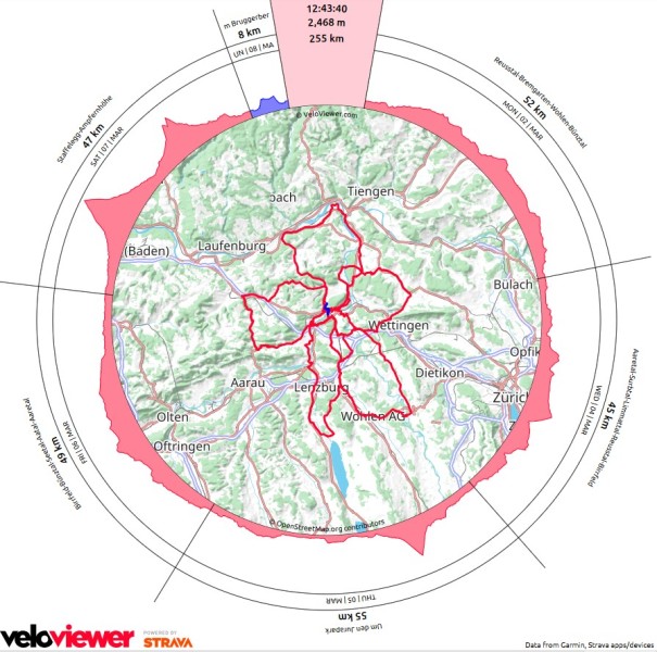 | Radfahren, draussen | 5 | 247 | 2’377 | 55 KM |