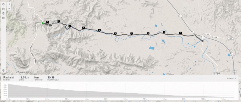 Eine Verbindungsstrasse in der Rambla de la Ballabona, eigentlich ein Flussbett. Auf unseren Touren ist sie eine der abwechslungsreichsten Strecken auf kürzester Distanz. Sie verbindet den direkten Weg zwischen Lubrin über La Rambla Aljibe und Zurgena (in der Höhe) mit der Strasse zwischen Cuevas de Almanzora und Antas (in der Tiefe). Ihre Länge ist 11.5 KM und die Höhendifferenz beträgt etwa 450 Höhenmeter. Wie hier üblich, hat auch diese Strasse einen sehr guten Belag,