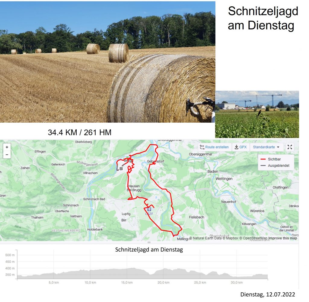 Zum vollständigen Text =>: Schnitzeljagd am DienstagRund um das Birrfeld und im Reusstal wieder zurück. Das GPS registrierte 34.3 KM und 261 Höhenmeter.